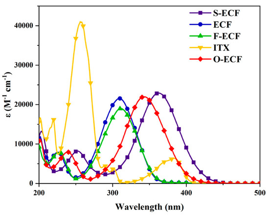 Examination of their absorption properties in acetonitrile revealed the shift of the absorptions to be comparable to that observed for the previous MBFs. Thus, the introduction of electron-donating groups redshifted the absorption (S-ECF and O-ECF) whereas the opposite effect was found in the presence of electron-accepting groups (F-ECF) (See Figure 6 and Table 4). The most redshifted absorption was found for S-ECF, peaking at 362 nm. Irrespective of the substitution pattern, almost similar molar extinction coefficients could be found for the different dyes.