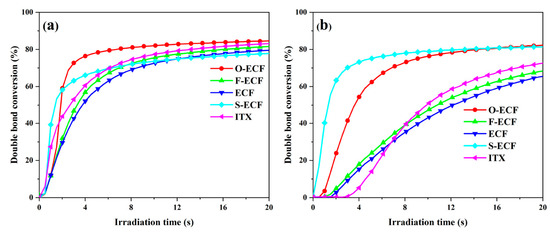 Polymerization tests carried out at 405 nm and 455 nm during the FRP of TPGDA revealed O-ECF to outperform the reference photoinitiator 2-isopropylthioxanthone (ITX) during the 20 first seconds of irradiation (See Figure 7 and Table 5). After 240 s of irradiation, all ECFs could furnish monomer conversions comparable to that of ITX at 405 nm. Noticeably, no significant difference in monomer conversions could be observed between ECFs substituted with electron-donating or electron-accepting groups. At 455 nm, a higher variation of the monomer conversion was found, attributable to differences in absorption at this specific wavelength.