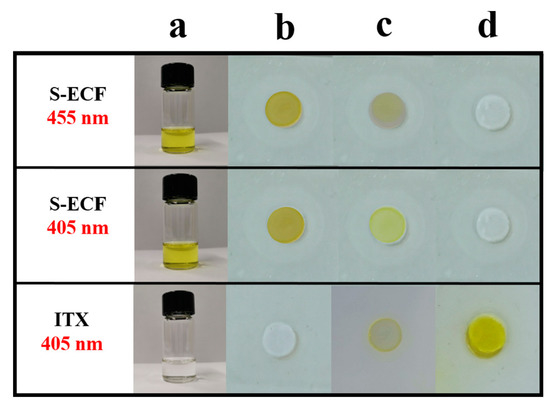 Photobleaching experiments were carried out with the two-component S-ECF/EDB combination. (a) initial solution (b) sample before irradiation (c) after 8 s (d) after 15 s of irradiation. Reproduced with the permission of Ref. [207]. Copyright 2007, Elsevier.