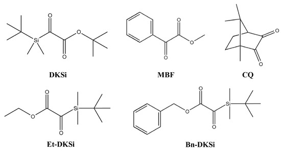 In 2017, Lalevée and coworkers proposed a new family of glyoxylate, namely silyl glyoxylates (See Figure 9) [232,233]. Tert-butyl (tert-butyldimethylsilyl)glyoxylate (DKSi), ethyl(tert-butyldimethyl)silyl glyoxylate (Et-DKSi), and benzyl (tert-butyldimethyl)silyl glyoxylate (Bn-DKSi) were examined as monocomponent photoinitiating systems or in combination with additives (See Figure 10) for the FRP of a dental resin, namely a BisGMA/TEGDMA (70/30 w/w) blend (where BisGMA and TEGDMA stand for bisphenol A-glycidyl methacrylate and triethylene glycol dimethacrylate respectively) or urethane dimethacrylate (UDMA).
