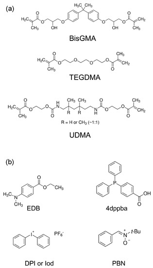 - Bouzrati-Zerelli, M.; Maier, M.; Fik, C.P.; Dietlin, C.; Morlet-Savary, F.; Fouassier, J.P.; Klee, J.E.; Lalevée, J. A Low Migration Phosphine to Overcome the Oxygen Inhibition in New High Performance Photoinitiating Systems for Photocurable Dental Type Resins. Polym. Int. 2017, 66, 504–511. [Google Scholar] [CrossRef]