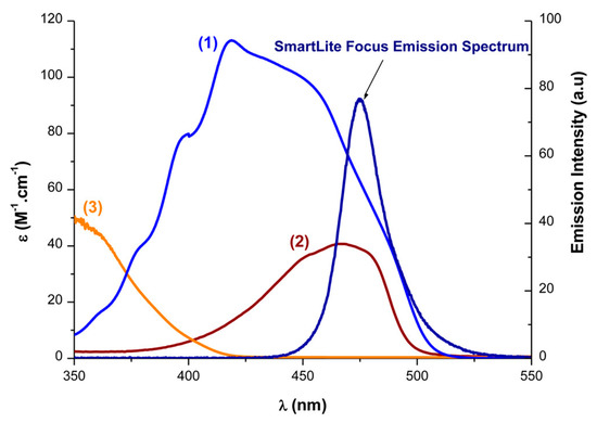 During the past decade, photopolymerization has witnessed intense research efforts, supported by the development of more and more applications making use of photopolymerization, but also by the gradual abandonment of conventional UV curing using mercury lamps in favor of more energy-efficient LED-triggered polymerization processes [1]. Notably, the recent development of light-emitting diodes (LEDs) that are cheap, compact, lightweight, and energy-saving devices has discarded the historical UV irradiation setups that are expensive and energy-consuming devices [2,3,4,5,6,7,8,9]. Parallel to this, UV photopolymerization is facing numerous criticisms such as safety concerns (eye and skin damage) or the production of ozone during photopolymerization [10,11]. Intense efforts existing at present to develop photoinitiating systems absorbing visible light are also supported by the different applications using photopolymerization and 3D and 4D printing, dentistry, adhesives, solvent-free paints, microelectronics, coatings and varnishes can be cited as relevant examples [12,13,14,15,16,17,18,19,20,21,22,23,24,25].