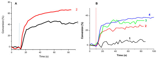 Polymerization profiles determined for a BisGMA/TEGDMA blend upon irradiation at 477 nm (I = 300 mW/cm²) in thin films using (A) In laminate: (1) DKSi (5wt%); (2) DKSi/EDB (5%/2% w/w). (B) Under air: (1) DKSi (2wt%); (2) DKSi/EDB (2/1.4% w/w); (3) DKSi/EDB/DPI (2/1.4/1.6% w/w/w); (4) DKSi/EDB/DPI/CQ (2/1.4/1.6/1% w/w/w/w). Reproduced with permission of Ref. [232]. Copyright 2017. The American Chemical Society.