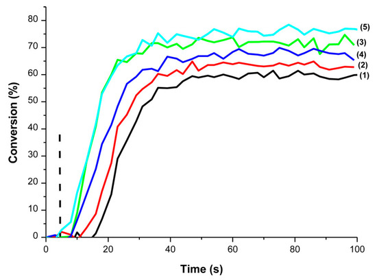 Polymerization profiles of 1.4 mm thick samples of UDMA resin upon irradiation at 477 nm (I = 80 mW/cm²) under air using DKSi (1) 0.5 wt%, (2) 1wt%, (3) 2 wt%, (4) 3 wt%, (5) 5 wt%. Reproduced with permission of Ref. [232]. Copyright 2017. The American Chemical Society.