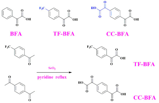 From the synthetic viewpoint, TF-BFA and CC-TFA could be prepared in one step, by oxidation of the acetyl groups with selenium oxide, and obtained reaction yields of 80 and 62%, respectively. As observed for MBFs and ECFs, the presence of the electron-accepting CF3 group blueshifted the absorption compared with the parent structure BFA (244 nm for TF-CFA vs. 253 nm for BFA). Conversely, a redshift of the absorption was found for CC-BFA at 262 nm. Interestingly, a significant increase of the molar extinction coefficient was found, peaking at 18,480 M−1·cm−1 contrarily to 8640 M−1·cm−1 for BFA and TF-BFA (See Figure 17).