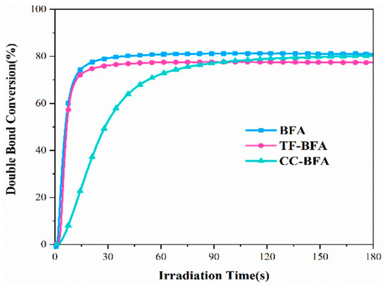 A similar trend was determined during the FRP of a water-soluble monomer, namely PEG diacrylate (PEGDA). Upon irradiation at 405 nm and by performing the polymerization experiments in water, a conversion of ca. 80% could be obtained within 180 s (see Figure 19). Besides, a slower polymerization rate could be evidenced for CC-BFA, resulting from its poor water solubility.