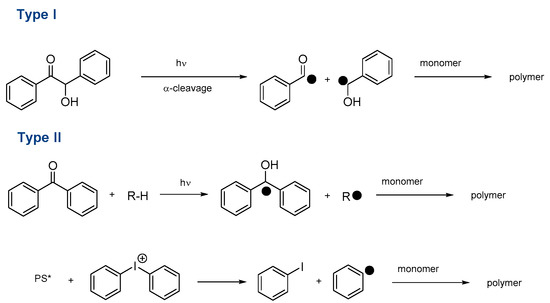 Radical generation with Type I and Type II photoinitiators. (* corresponds to the excited state of PS).