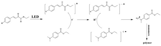 Photolysis experiments carried out in acetonitrile revealed the different ECFs to be unable to generate radicals alone. Upon addition of ethyl dimethylaminobenzoate (EDB), a fast photolysis process could be evidenced and the formation of α-aminoalkyl radicals was confirmed by electron spin resonance (EPR) experiments. Overall, the mechanism of radical generation proposed in Scheme 4 was suggested. The initiation mechanism is that of a type II photoinitiator. Thus, upon photoexcitation, a photoinduced electron transfer between EDB and ECFs can occur, generating EDB radical cations and ECF radical anions. In the second step, a hydrogen abstraction reaction can occur, generating α-aminoalkyl radicals on EDB and constituting the initiating species. It has to be noticed that the different radicals formed during photolysis have been identified by electron spin resonance (ESR) experiments.