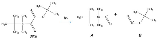 Excellent monomer conversions could also be obtained using 4-diphenylphosphinobenzoic aid acid as the additive. The choice of this additive was notably motivated by its ability to efficiently overcome oxygen inhibition by converting the non-reactive peroxyl ROO• radicals as initiating species RO• [234]. Investigation of the substituent effects with Et-DKSi and Bn-DKSi revealed the absorption spectra not to be modified except for the molar extinction coefficients (see Figure 15). When tested as monocomponent systems for the FRP of UDMA (1 wt%), the order of monomer conversions perfectly fit with the order of the molar extinction coefficients, evidencing that the reactivity was governed by the molar extinction coefficients and not by the substitution pattern of silyl glyoxylates. By ESR, the formation of radicals in the close vicinity of Si was detected under an inert atmosphere (radical A). A different situation was found under air. No silyl radicals were detected anymore due to the fast reaction with oxygen, producing peroxyl radicals. Formation of t-BuOO• was also detected under air, resulting from a decarboxylation reaction of radical B and subsequent reaction with oxygen (See Scheme 5).