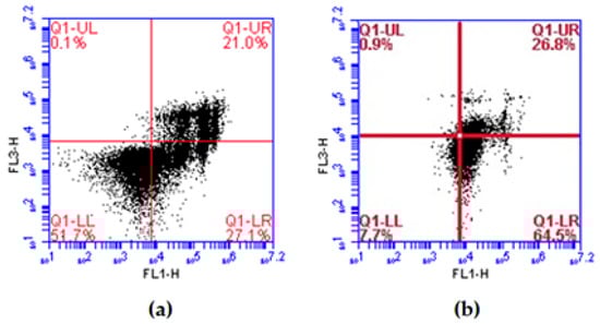 The cells were cultured for 24 h in the absence and the presence of the lectins, as described above, and then they were washed with phosphate-buffered saline (PBS), collected by centrifugation (450× g, 5 min), and evaluated for occurrence of apoptosis and/or necrosis using the Annexin V-FITC/PI kit (Invitrogen, Waltham, MA, USA) following the manufacturer’s instructions. The analysis was performed on a BD Accuri C6 flow cytometer (BD Biosciences, Franklin Lakes, NJ, USA) with a collection of 10,000 events per sample. Double-labeled cells were in late apoptosis; cells labeled with AnnV-FITC alone were considered to be in an early stage of apoptosis; cells labeled only with PI were considered in the process of necrosis; and unlabeled cells were considered viable. Each experiment was performed in triplicate.