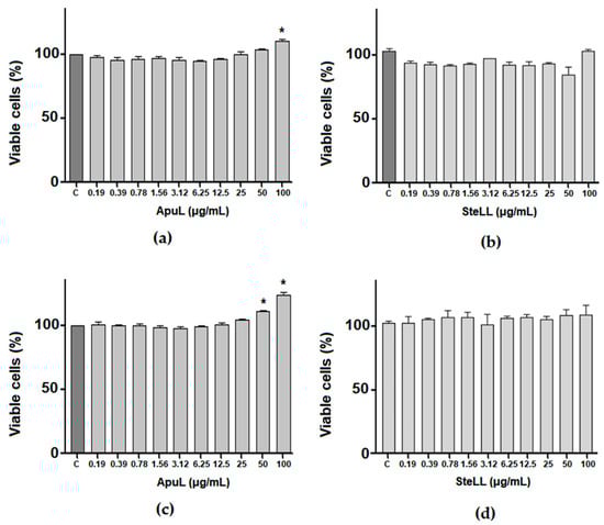 Evaluation of the viability of MSCs treated with different concentrations (0.19–100 μg/mL) of ApuL (a,c) or SteLL (b,d) for 24 h (a,b) and 48 h (c,d), using the MTT assay. The bars represent the mean cell viability (%) ± SD for three independent experiments performed in triplicate, considering the control group as 100% viability. (*) p < 0.05 in comparison with control (C).