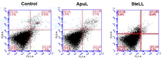 Representative dot plots of the cell death evaluation of mesenchymal stem cells (MSCs) from control or treated with ApuL or SteLL at 50 µg/mL. Quadrant LL: viable cells. UL quadrant: cells stained with propidium iodide. Quadrant LR: cells labeled with annexin V. Quadrant UR: cells labeled with annexin V and propidium iodide.