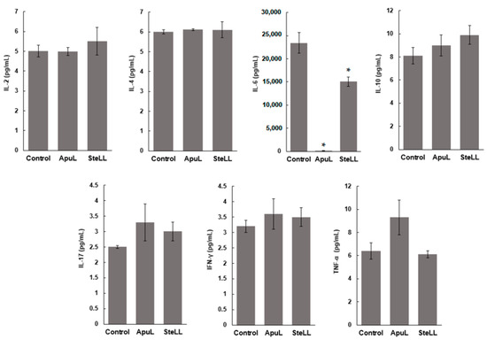 MSCs produced pro-inflammatory (TNF-α and IFN-γ, IL-2, IL-6, IL-17) and anti-inflammatory (IL-4 and IL-10) cytokines, but the levels of most of these cytokines were not significantly changed after treatment with ApuL or SteLL (50 μg/mL) (Figure 4). However, the high concentration of IL-6 (23,431 pg/mL) released by MSCs was reduced in the presence of SteLL to 15,045 pg/mL, and it was strongly suppressed to 101.8 pg/mL (99.5% reduction) when MSCs were treated with ApuL (Figure 4).