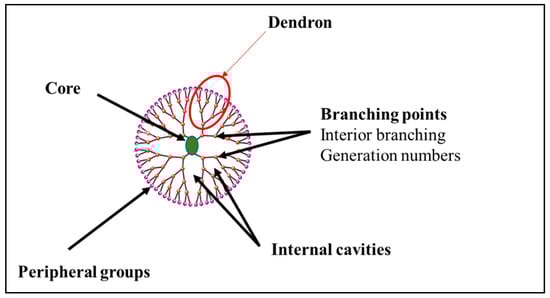 Dendrimers are composed of three parts. From the inside to the outside, the structure of a dendrimer consists of a core with a multitude of branches grafted to its internal cavities and terminal groups at the periphery (Figure 1). The identical parts connected to the core are called “dendrons” (Figure 1). Their number depends on the multivalence of the core used as a nucleus [7].