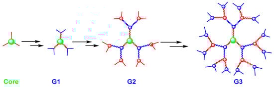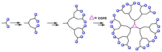 Convergent methods were developed with the aim of limiting the purification problems encountered in divergent methods. In this approach, the dendrimer is constructed in several steps, starting from the peripheral clusters, and progressing inwards to the core, unlike the divergent method (Figure 3). When the desired branching polymeric arms, i.e., dendrons. are formed, they are attached to a central multifunctional molecule [21]. The concept of using a convergent approach for the synthesis of dendritic macromolecules has several advantages, including the following: the small number of coupling reactions for each growth step allows for a better control of the synthesis; the appearance of defects in the final structure is minimized and large excesses of reagents are avoided, which simplifies the purification. However, this approach does not allow the formation of high generations because steric problems arise in the reactions between the dendrons and the central molecule [21,22]