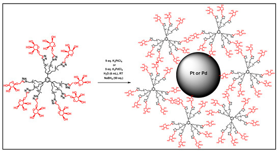 In 2008, Guangnan and his team worked on the encapsulation of Pd nanoparticles in dendrimers (PdDENs) derived from negatively charged PAMAM. These PdDENs are very stable in ionic liquids and can be used as highly active catalysts for the hydrogenation of styrene with an efficiency maintained after 12 recycles [99]. Other glycodendrimer-stabilized palladium nanoparticles (PdDENs) (Figure 9) showed good catalytic activity in water for the reduction of 4-nitrophenol (4-NP) to 4-aminophenol (4-AP) and in the C–C Miyaura–Suzuki coupling with substituted aryl bromide [96].