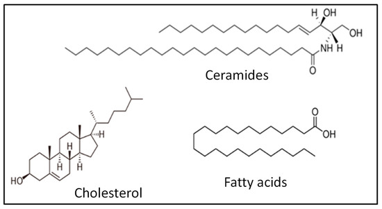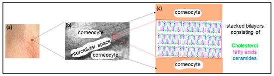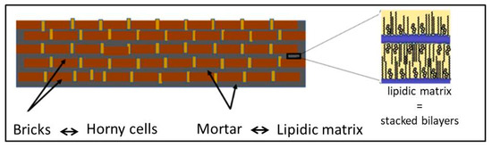 The SC is the outermost layer of the mammalian epidermis and is responsible for the barrier function of the skin [156,157]. It dictates the rate of absorption of exogenous molecules by the skin and prevents water loss from the body [156]. The SC is mainly composed of flattened, fully keratinized dead cells (corneocytes) embedded in an intercellular space (multilamellar lipid matrix) consisting of stacked bilayers (Figure 13) [158]. The “bricks and mortar” model is generally used to describe the structure of this layer, where the bricks represent the corneocytes and the mortar represents the lipid matrix (Figure 14) [159].