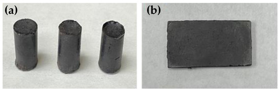 (a) Representative photos of compressive cylinders and (b) rectangular prisms for flexural strength testing of the guaiacol–fatty acid–sulfur composites. All of the composites have the same visual appearance. Samples of GO10S80 are shown as an example.