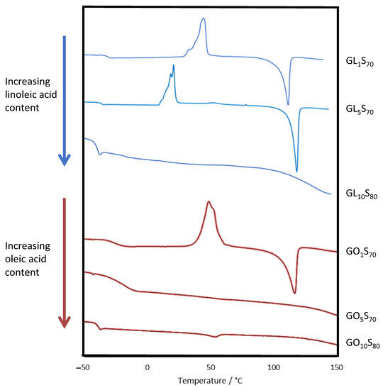 The composites were also characterized by Fourier-transform infrared spectroscopy (FTIR, Figure S1, Supplementary Materials). Most notably, IR spectra revealed consumption of olefin units as evidenced by the disappearance of out-of-plane alkene C–H bends, which appear at ~933 cm−1 in both oleic and linoleic acid, but which are absent or very weak in the composites.