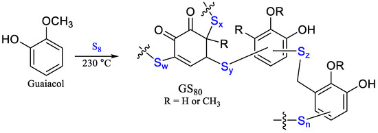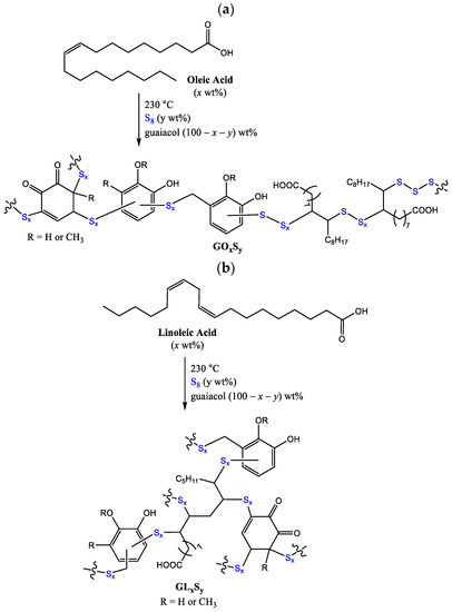The reaction of guaiacol and fatty acids with elemental sulfur leads to formation of (a) composites GOxSy and (b) GLxSy. This is a random polymerization, so organic units attached to each end of a sulfur chain are expected to be variable.
