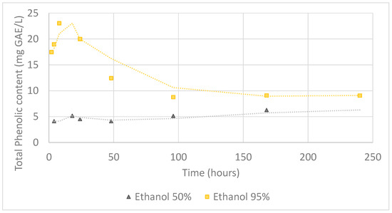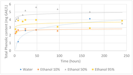 Migration assays from coatings/packaging to food should follow well-established procedures that allow users to identify if there is a significant migration to food of a toxic compound or if the active compounds of the packaging/coating are migrating to the food. In this work, four different ethanolic/water solutions were tested, each of them representing a food simulant: water (for water-based products); 10% (v/v) ethanol in water (for alcoholic products); 50% (v/v) ethanol in water (for dairy products); and 95% (v/v) ethanol in water (for fatty products) [46,47]. For the migration assay, the total phenolic content and antioxidant activity were analyzed in the different food simulants over time.