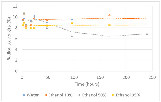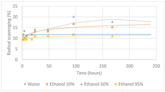 The results for ACEO biobased films (Figure 4) presented a higher radical scavenging capacity, going from 9 to values up to 20%. Migration results showed that the highest percentage of radical scavenging occurred later for the ethanol 10% and 50%, with the maximum being around 96 h, showing an increased liberation of compounds with antioxidant activity compared to the CCEO. For water and 95% ethanol, the release of compounds with antioxidant activity started already at the beginning of the essay, and was steady throughout the study. The fact that this trend was observed for the ACEO biobased films indicates that the release was gradual, which helped to maintain and increase the antioxidant activity observed in the different simulant media, particularly in the ethanolic solutions. This characteristic is important to increase the shelf life of products. A higher affinity of the CCEO to the polymeric matrix compared with the affinity of ACEO, given the composition of both oils (as discussed previously in Section 3.2.1) may explain the higher antioxidant activity observed in the simulants obtained after the migration of ACEO from chitosan films.
