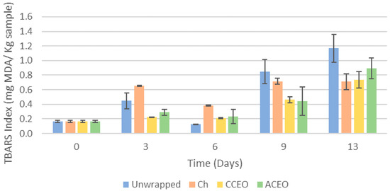 The TBARS assay is used to quantify the malonaldehyde (MDA) present in the sample and indicates the lipid rancidity of meat products [16]. In terms of results, in all the samples, an increase in the malonaldehyde concentration was observed, being the highest in the unwrapped meat, but also very similar to the meat wrapped with pristine chitosan at day 9 (Figure 5). Until day 9, the application of EOs to the film prevented the lipidic oxidation of the meat, at which point the lower values can be observed, both in CCEO or in ACEO. The CCEO-wrapped samples presented a slightly lower MDA concentration, with the lowest being observed in the sample wrapped with film without EOs at day 13. Rezaeifar et al. 2020 [22] studied the edible coating of trout and its chitosan control and showed that ACEO presented a good effect on the antioxidant activity of the coating, reducing the TBARS value from 2.78 to 1.67 mg MDA/Kg meat. Hosseini et al., 2021 [52] also showed effective results from the application of ACEO to the coating, due to the presence of geranial, neral and limonene as antioxidants [52]. Olorunsanya et al., 2010 [57] reported that, in various concentrations (0.5, 1 and 1.5% in films), CCEO always showed an effective improvement of the lipidic stability during storage [57]. In this study, both essential oils were effective until day 9, but at day 13, the difference with chitosan was neglectable, probably due to the oxidation of the EOs themselves.