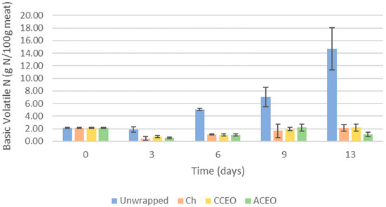 The unwrapped meat presented the highest increase in BVN, which went from 2.1 to 14.7 g of N per 100 g of meat (Figure 6). Contrary to this, all the wrapped meat presented similar nitrogen values to the initial ones, which is probably significant in terms of slower times of the degradation of the proteins and amines, increasing the shelf life. In a way similar to our samples, [22] presented results with a significant increase in the control with no film, with levels of BVN in samples wrapped in chitosan and ACEO being lower by around 80%, reporting a possibility of the phenolic compounds decreasing the growth of microorganisms and consequently preventing the spoilage and breakdown of the proteins. For CCEO, the change in BNV presented by Hosseinzadeh et al., 2020 [53] was similar to the results presented in this study for 0.5% and 1.5% CCEO films, but BNV data were smaller than those from this study because it was a study with minced meat.