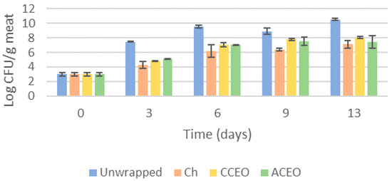 In general, all the wrappers were effective in controlling the microbial growth of the analyzed microorganisms, showing the capacity to increase shelf life. Previous investigations also reported similar behavior of essential oils as that seen in this study, reporting around 6 log(CFU/g) for mesophilic bacteria in poultry wrapped with ACEO, near 7 log(CFU/g) for psychotropic bacteria and around 4 log(CFU/g) for Enterobacteriaceae, although it was not possible to compare to a chitosan film without oil [53]. Trout samples wrapped with edible ACEO presented levels of 4.56 log (CFU/g) compared to a control chitosan (6.19 log (CFU/g)) at 12 days of storage for the total volatile countable microorganisms, and 4.89 log(CFU/g) for Enterobacteriaceae with ACEO, which is 1.3 lower than the chitosan control [27]. CCEO in minced meat presented values for total bacteria a little below 8 log(CFU/g) for 0.5 and 1.5% EO, compared to chitosan and unwrapped meat, which almost reached 9 log(CFU/g). Psychotropic bacteria presented similar values for the EO, but with chitosan and unwrapped meat at around 8.5 log(CFU/g), followed by Enterobacteriaceae with a 8.5 to 9.5 log(CFU/g) difference between them [55].