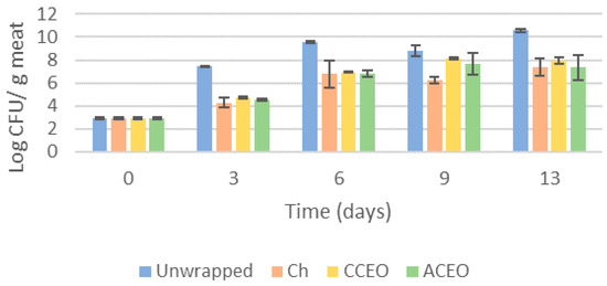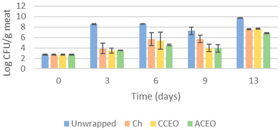 The results show that both mesophilic (Figure 7) and psychotropic (Figure 8) microorganisms grew throughout the 13 days, and that in the wrapped meat the growth was slower compared to the unwrapped meat, as expected. All the wrapped samples presented throughout the 13 days similar behavior, with no differences among films with and without EOs. This reduced growth of microorganisms wrapped in chitosan is attribute to the intrinsic antimicrobial activity of the chitosan [10].