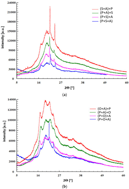 For the original, non-gelatinized P sample, the crystallinity index was 0.35, while for other samples with P gelatinized prior to complexation, it significantly decreased (Figure 3). Evidently, in complexes, P retained its amorphous character. The values of Xc for all samples were as follows in descending order of the crystallinity index (Xc): (P+A+S) 0.28, (P+S)+A 0.15, (P+A)+S 0.14, (S+A) +P 0.10, (P+A+O) 0.15, (P+O)+A and (O+A)+P 0.11, (P+A)+O 0.09.