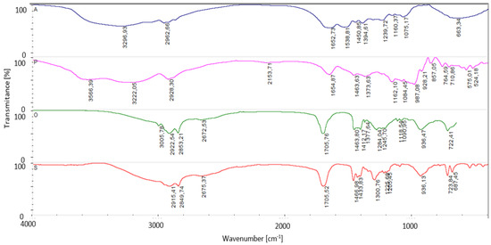 Based on literature data [57,58,59,60] in the spectrum of P (Figure 5), a band at 3321 cm−1 is attributed to the stretching vibrations of the hydroxyl group (O–H), a reduced band at 2924 cm−1 is assigned to the C–H stretching vibrations, and the peaks at 1021 and 1151 cm−1 belong to stretching vibrations of C–O–C. The 1464 cm−1 band is assigned to –CH2 bending and –COO stretch, 1084 cm−1 and 1022 cm−1 are assigned to the crystalline and amorphous regions of starch, respectively, and 1162 cm−1 is assigned to vibrations of the glucosidic C-O-C bond and the whole glucose ring, which can present different modes of vibrations and bending conformations. The bond at 928 cm−1 was assigned to the skeletal mode vibrations of α 1 → 4 skeletal glycoside bonds, 780 cm−1 was assigned to the C-C stretch, and 575 cm−1 was assigned to the skeletal modes of the pyranose ring.