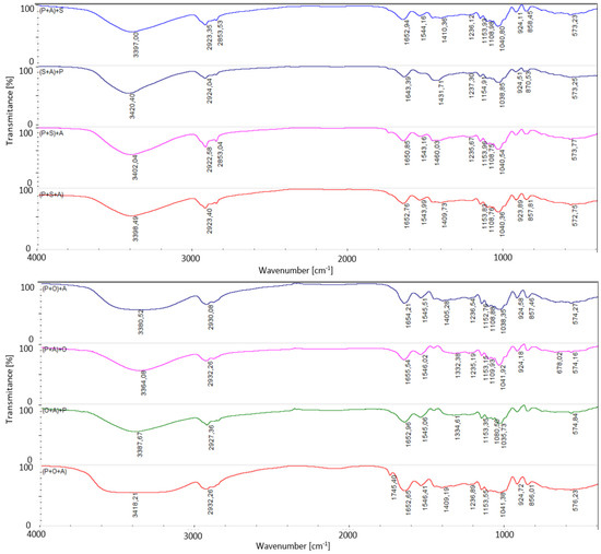 The spectra of those ternary complexes (Figure 7) fairly closely resembled one another. In the spectra with S, the band of the COOH group above 1700 cm−1 resided in a residual form, whereas in the corresponding spectra with A, it completely ceased except for the spectrum of (P+O+A). That pointed to an equilibrium established in that ternary system.