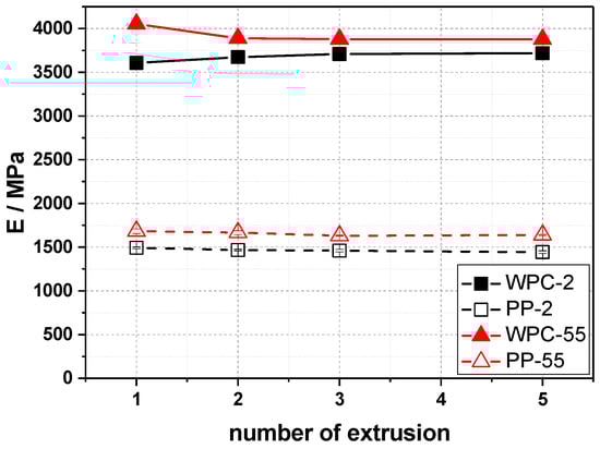 Tensile elastic modulus vs. number of extrusion cycles for the investigated WPC and the respective base PP grades (Error bars giving +/− one standard deviation for the modulus values are smaller than the symbols).