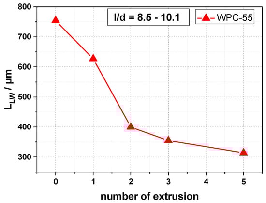 Length weighted wood particle length vs. number of extrusion cycles for the investigated WPC-55 (number of extrusion “0” refers to the original wood particles).