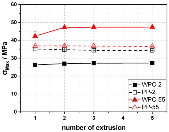 In the case of the tensile strength (Figure 3), again the values for the unreinforced PP grades do not change significantly in the investigated region. The WPC-55 shows a higher tensile strength than the base PP grade, while for WPC-2 a lower tensile strength can be found. This is due to improved wetting with the WPC-55. In addition, for PP-2, the tensile strength shows some yielding, which is reduced by adding solid particles, thus leading to the reduction in the strength value. The number of processing cycles only shows the influence between the first and second processing cycles as here the wood particle size is reduced the most, thus, the tensile strength is increased as the finer particles exhibit higher specific surface and can therefore carry a higher load. This is a pronounced effect for the WPC-55, but is also visible to a smaller extent for the WPC-2—the difference between these two again being the wetting of the particles by the matrix. Afterwards the values stay the same; the wood particle size does not change too much after that either (Figure 3).