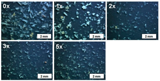 Micrographs of the extracted wood particles for length measurement vs. number of extrusion cycles for the investigated WPC-55 (number of extrusion “0” refers to the original wood particles).