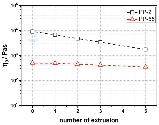 Looking at the zero-shear viscosity (Figure 6), one can see that it is reduced for both PP-55 and PP-2 over the number of processing cycles. The reduction is more severe with PP-2, as this material exhibits the longer chains and therefore the higher viscosity—which also means that more shear can be applied to the material. The viscosity reduction for PP-55 is less pronounced. Overall, PP-2 exhibits significantly higher viscosity than PP-55, also after 5 extrusion cycles. This viscosity difference also explains part of the mechanical behavior, as well as the thermal degradation discussed later in the paper.