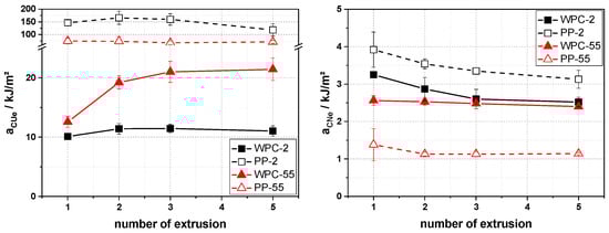 The impact behavior of the different samples was investigated by applying unnotched and notched Charpy impact tests (Figure 7). In the case of the unnotched impact strength, the WPC showed lower values than the unreinforced PP grades, which is due to the fact that the fracture mechanism is altered. While the PP specimen flex more (due to their lower elastic modulus) and typically show a non-break behavior, the WPC are much stiffer and break completely in this test. With the increased number of cycles, an increase in unnotched impact strength can be seen; this is due to the reduction in particle size (Figure 3), as this reduces the stress concentrations, and therefore more energy is needed to fracture the sample. This is more pronounced in the WPC-55 than the WPC-2, which we again attribute to the higher wetting of the particles in WPC-55. Looking at the notched impact strength (Figure 7), a different picture can be seen. Here, PP-2 shows higher values than PP-55 due to the higher chain lengths, which need more energy in crack propagation through the specimen. The notched impact values for the WPC are in the middle of the values for the unreinforced PP; with the shorter PP chains (WPC-55), the wood particles provide some additional reinforcement, but with the longer chains (WPC-2), the wood particles provide a less-resistant crack pathway (as in PP-2 the chain length is the dominating factor here) most likely by hindering polymer chain entanglement and movement. With an increasing number of processing cycles, PP-2 and WPC-2 show some reduction in notched impact strength, which we attribute to polymer degradation, as also shown by the viscosity measurements (Figure 6). For PP-55 and WPC-55 the notched impact strength does not change significantly in the investigated region, but here, polymer chain degradation is less severe as these are much shorter to begin with.