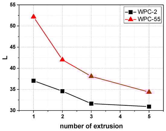 Lightness (L) from color measurement vs. number of extrusion cycles for the investigated WPC.