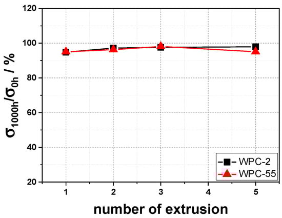 Another important property for a composite is the measure of durability in service, as such materials are usually applied for longer periods of time. As every process step inflicts shear and heat on the material, stabilizers are depleted; these same stabilizers, like radical scavengers, are also needed for stabilizing the material against degradation and weathering. To assess if there is an influence on durability, we looked at the behavior of the material after accelerated weathering. Specifically, we looked at the tensile strength, as strength values are more sensitive to degradation via weathering than modulus values. We compared the tensile strength after 1000 h of weathering with the value before the weathering. As shown in Figure 10, the tensile strength stays the same regardless of the number of processing cycles. This was not completely to be expected—although we are aware that not all stabilizers work over the whole temperature range, and the ones which are depleted at processing temperatures are not necessarily the ones effective at temperature conditions in the application—but shows that, when the overall degradation (as shown by the different properties before) is not too high, weathering stability should be sufficient if we consider the unweathered material being the proper choice in regard to weathering stability.