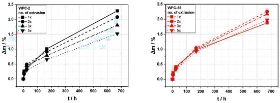 The last property investigated in this paper is the water uptake behavior of the WPCs. This is often a detrimental factor in durability as high levels of water uptake diminish mechanical properties, and can also accelerate weathering effects (e.g., by washing out degraded wood components). Looking at the water uptake (Figure 11) for WPC-2, there is a reduction in the water uptake with the increasing number of processing cycles. This is due to the fact that, with increasing processing cycles, the viscosity of PP-2 is reduced, thus yielding better wetting, and therefore, less water uptake. For WPC-55, the effect found is more an increase in water uptake, but only with long storage time. This effect could be due to the reduction in wood particle size during processing, which results in a higher specific surface and in more water pathways throughout the composite. Nevertheless, the effect here is not that pronounced, and would need more detailed investigations to look into the causes. Overall, the effect of multiple processing on the water uptake of WPC is limited in both cases.