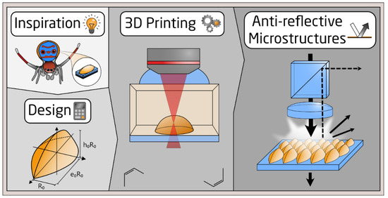 Figure 2. The fabrication and characterization of antireflective microarrays stimulated by the peacock spider’s super-black structures encountered in nature. First: different microarray 3D models are produced from a surface equation. Second: the arrays are invented in a polyacrylate resin via super-resolution 3D printing through two-photon polymerization. Third: the bioinspired micro-lens arrays show excellent antireflective properties [61].