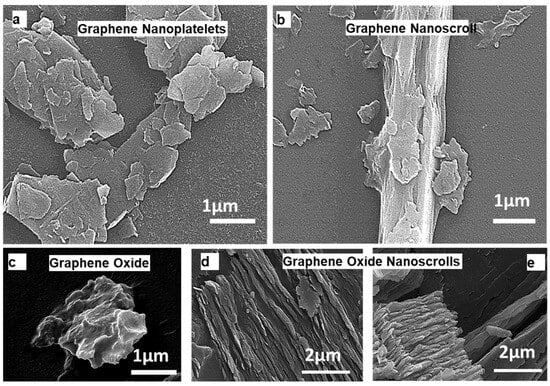 SEM images showcasing various graphene structures: (a) graphene nanoplatelets, (b) graphene nanoscrolls, (c) graphene oxide, and (d,e) graphene oxide nanoscrolls. ((a,b) reprinted with permission from Ref no. [23]).