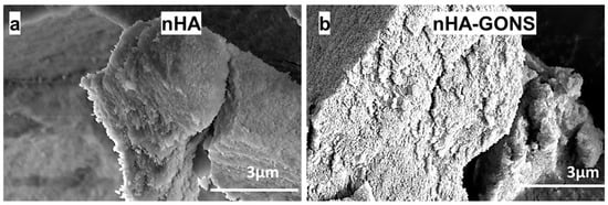 SEM images: (a) nHA and (b) composited nHA–GONSs.