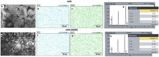 Comprehensive analysis of nHA and nHA–GONS surfaces: (a) SEM morphology of nHA; (b,c) EDS mapping of P and Ca adherence to nHA; (d) quantification of elemental weight percentages (C, O, P, Ca) on the nHA surface; (e) micrographs depicting the surface morphology of nHA–GONSs; (f,g) EDS analysis of P and Ca adherence to nHA–GONSs; and (h) corresponding elemental weight percentages (C, O, P, Ca) on the nHA–GONS surface.