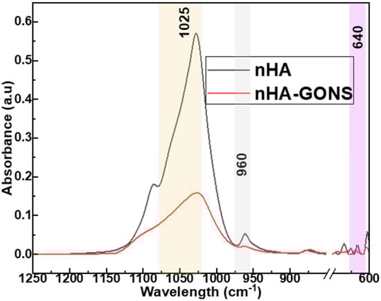 Additionally, the presence of characteristic peaks at 1025, 960, and 640 cm−1 in the nHA and nHA–GONSs, as shown in Figure 4, is indicative of the successful synthesis and retention of nHA’s structural integrity when coupled with GONSs. These peaks are characteristic of phosphate vibrations in the HA crystal lattice, where the peak at 1025 cm−1 corresponds to the ν3 mode of PO43− vibrations, the peak at 960 cm−1 to the ν1 mode of PO43− stretching, and the peak at 640 cm−1 to the ν4 mode of PO43− bending vibrations [27]. The presence of these peaks in both samples confirms the presence of nHA. The higher absorbance observed in nHA compared to the nHA–GONSs suggests a difference in the packing density due to a more dispersed and less densely packed structure compared to nHA.