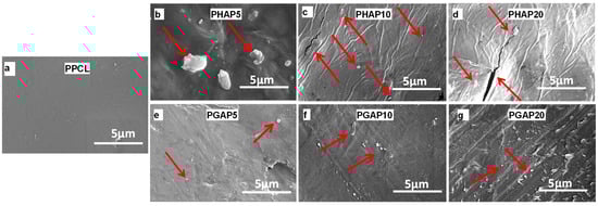 SEM images depicting polycaprolactone composites with nanofillers: (a) control without nanofiller; (b–d) nHA at 5%, 10%, and 20% concentrations; and (e–g) nHA–GONSs at 5%, 10%, and 20% concentrations (arrows indicate nHA particles.).