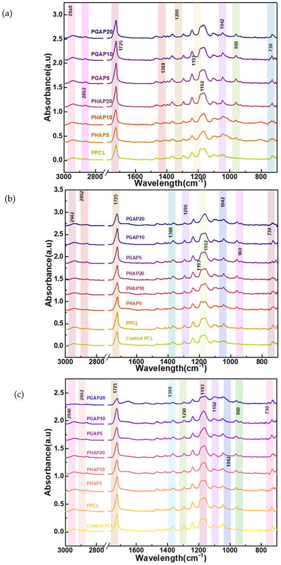 FTIR spectra for PCL and nHA and the PCL–nHA, and PCL–nHA–GONS composites: (a) pre-degradation; (b) after 14 days of enzymatic degradation; and (c) after 21 days of enzymatic degradation.