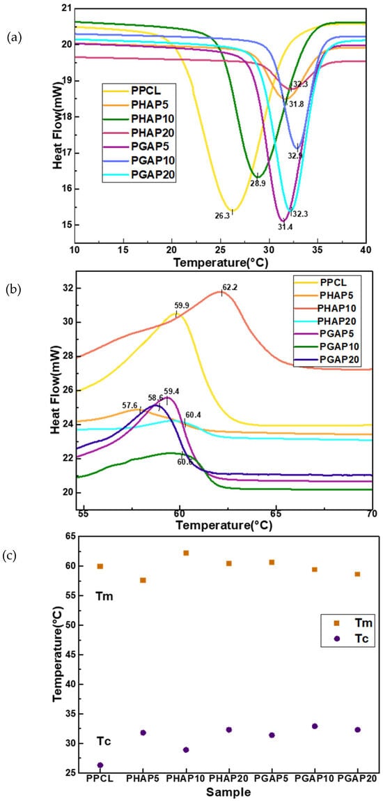Differential scanning calorimetry models for PCL composites: (a) cooling curve; (b) heating curve; and (c) overview of thermal properties.